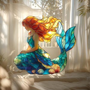 Mermaid Acrylic Suncatcher – Ocean-Themed Faux Stained Acrylic Window Hanging With Seashell Details