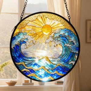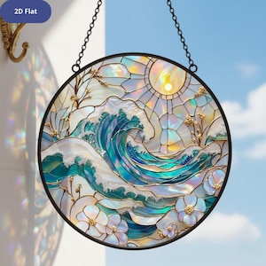 Ocean Wave Stained Glass Suncatcher, 2D Flat Ocean Wave Window Hanging Decor, Colorful Sun Catcher Ornament for Home, Garden & Gifts