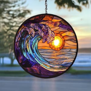 Ocean Wave Stained Glass Suncatcher: Coastal Beach Decor