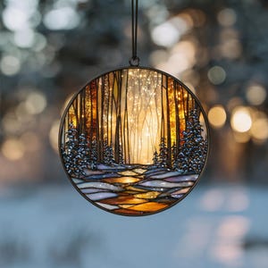 Mountain View ACRYLIC Suncatcher – Faux Stained Glass Window Hanging with Sunset Sky and Pine Forest – Scenic Nature Gift