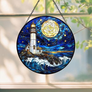 Blue Stained Glass Lighthouse Window Hanging Ocean Night Sky Suncatcher Decor