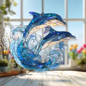 Dolphins Ocean Wave Acrylic Suncatcher, Stained Glass Style Blue Sea Window Panel, Coastal Nautical Marine Life Decor Hanging Ornament