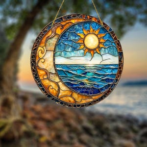 Coastal Sun and Moon Suncatcher Acrylic Window Hanging, Ocean View Hanging Decor, Beach Lover Gift, Boho Celestial Ornament