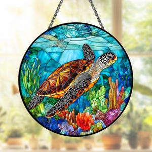 Stained Glass Sea Turtle Window Hanging Decoration, Ocean Reef Round Suncatcher Ornament